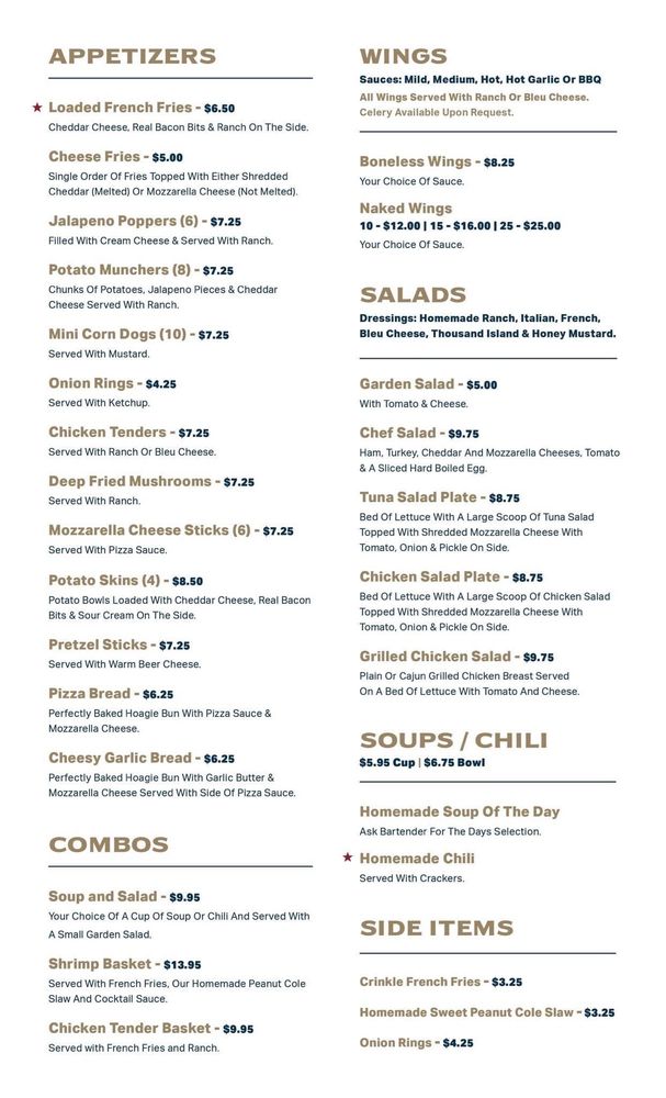 The highlights include fresh, vibrant salads like the garden salad adorned with cheese and a chef's salad featuring a medley of ham and turkey. For those craving comfort, the wings—offered in both boneless and breaded varieties—are a must-try, served with your choice of ranch or bleu cheese. Don't overlook the crispy crinkle fries and the unique homemade sweet peanut coleslaw, a customer favorite.